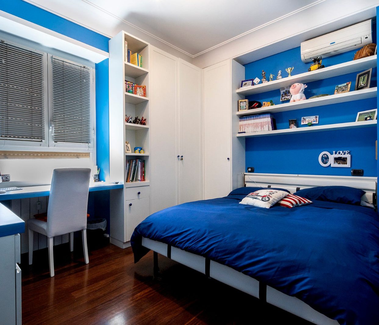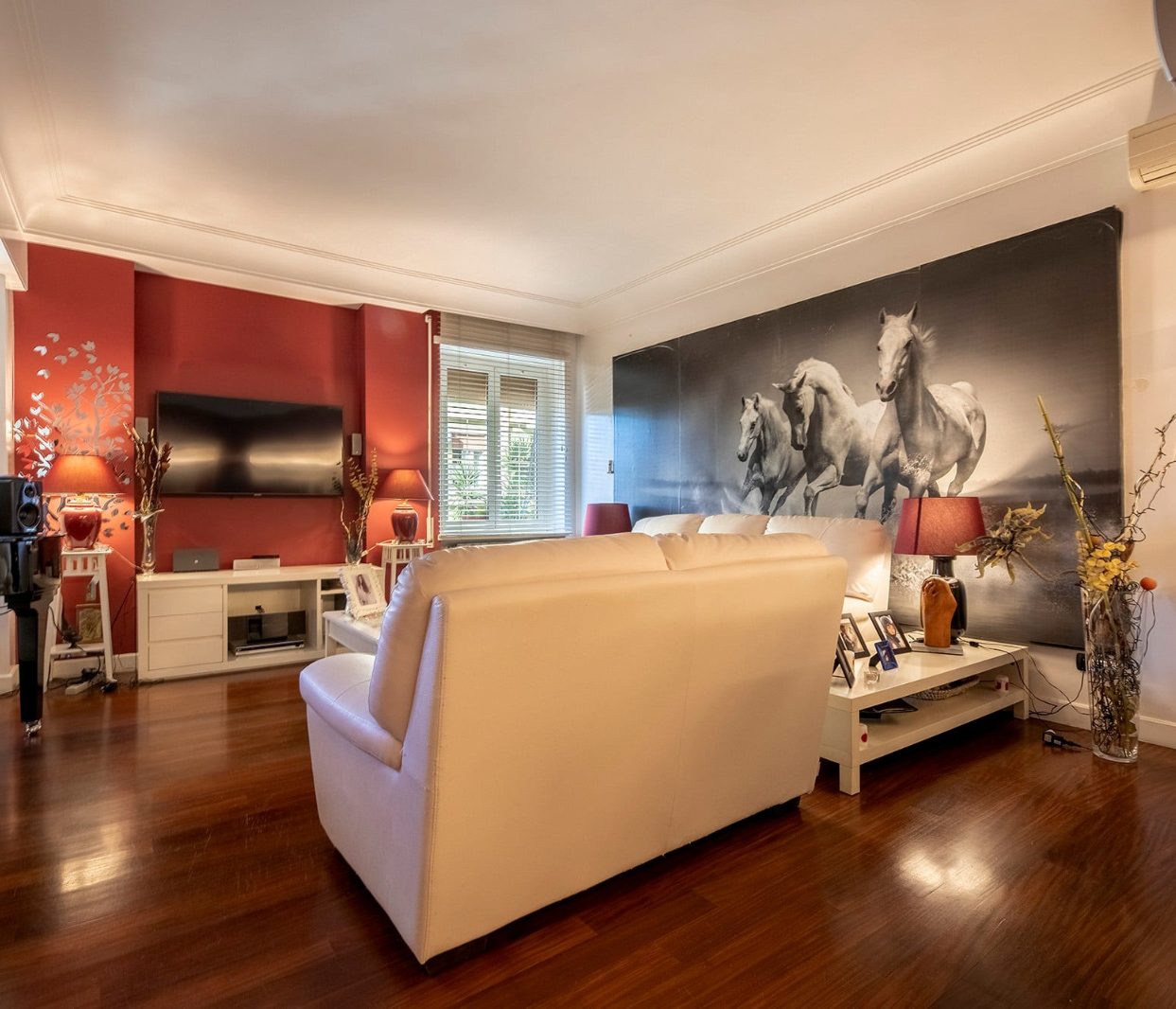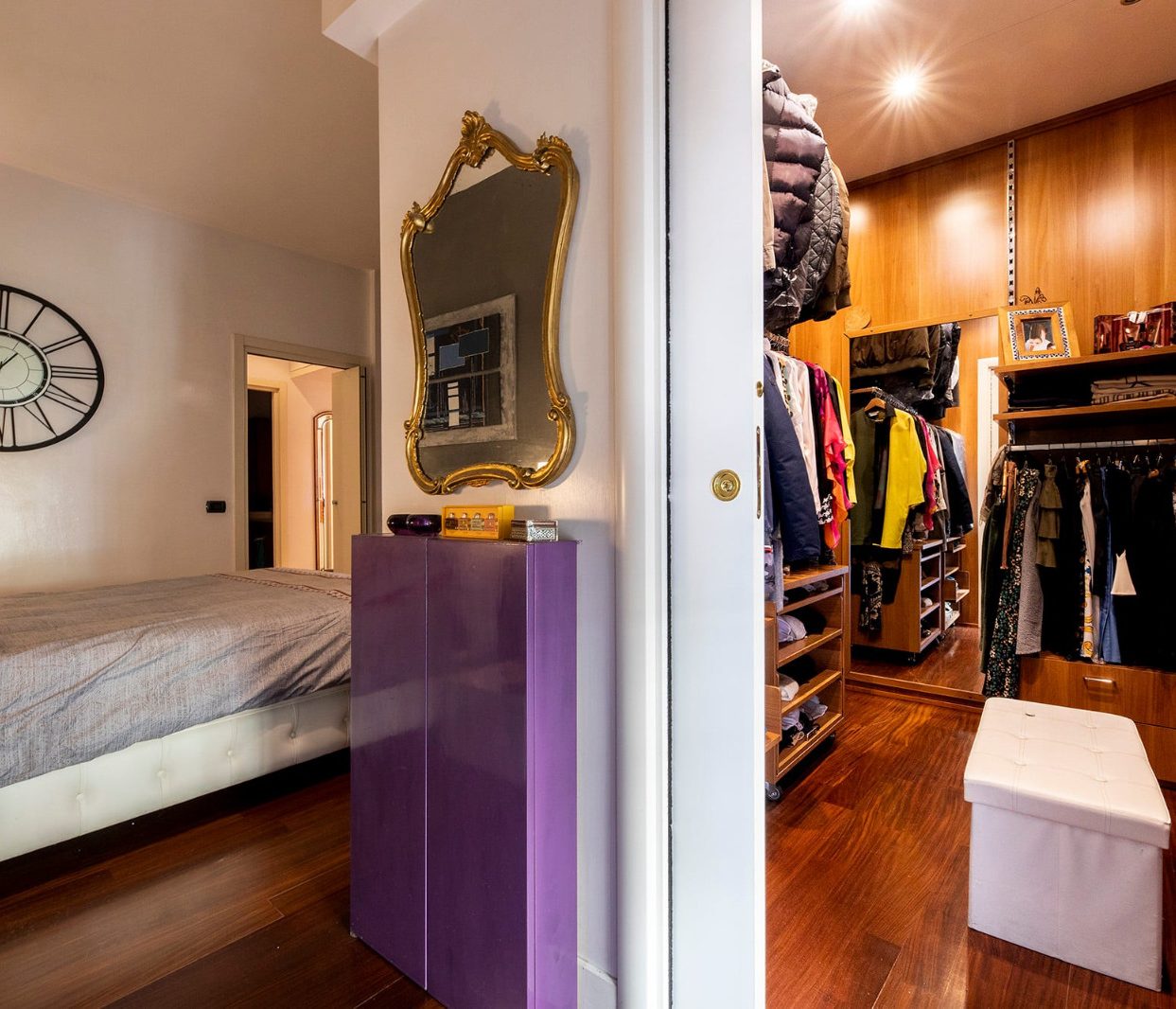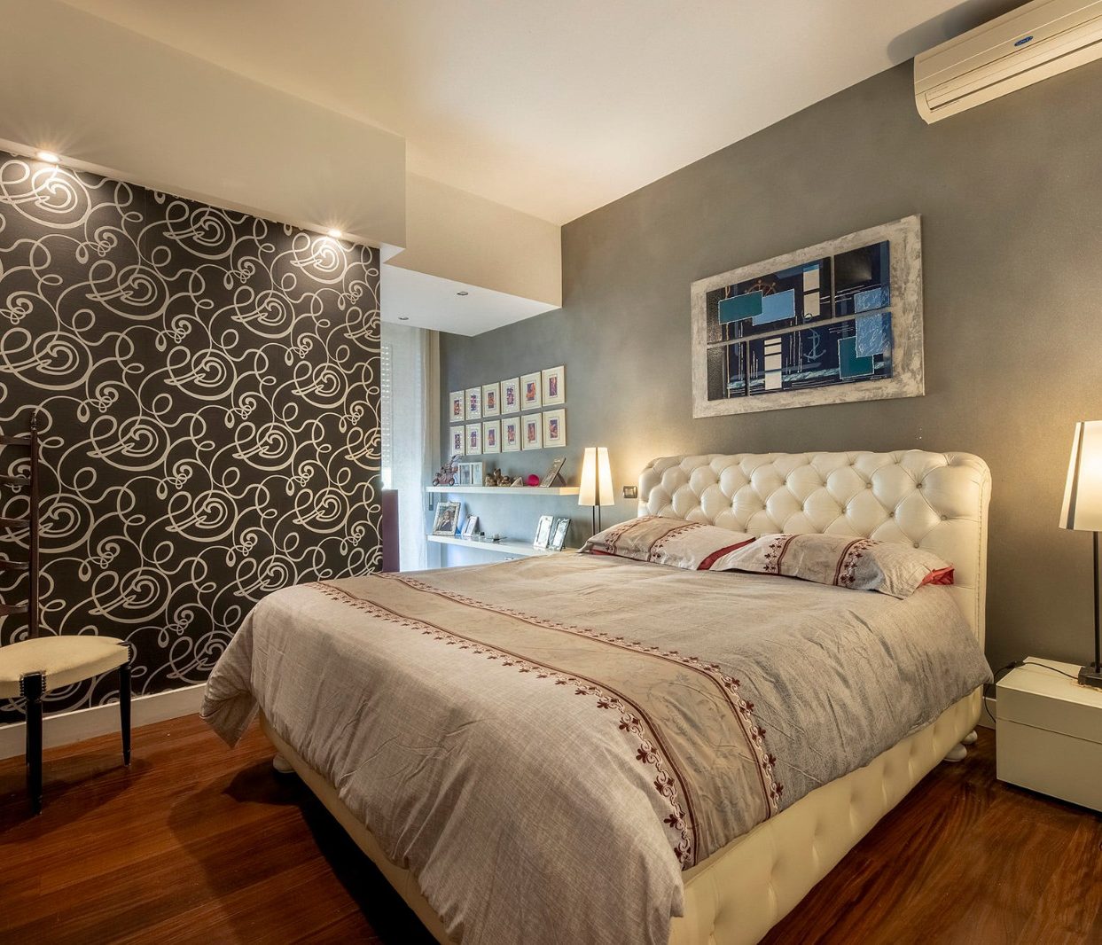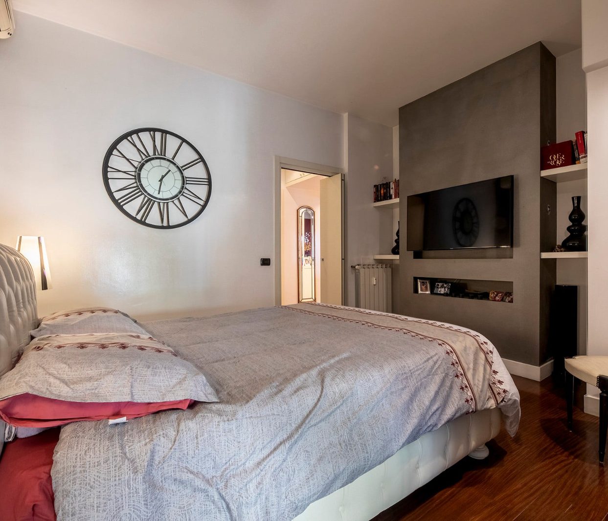 La proprietà si compone di un ampio soggiorno con accesso al balcone, cucina abitabile all'americana, letto ribaltabile e due bagni. Gli ambienti sono luminosi grazie alle ampie finestre, e l'appartamento è dotato di pavimenti in parquet, impianto di climatizzazione reversibile.